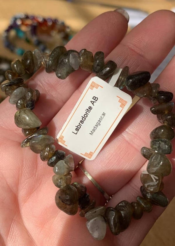 Bracelet en pierres naturelles de labradorite, en provenance de Madagascar. Pierre de la voyance elle absorbe les énergies négatives mais aussi elle atténue la sensibilité au froid, elle atténue les rhumatismes, elle aide à se désintoxiquer du tabac, de l’alcool et des drogues