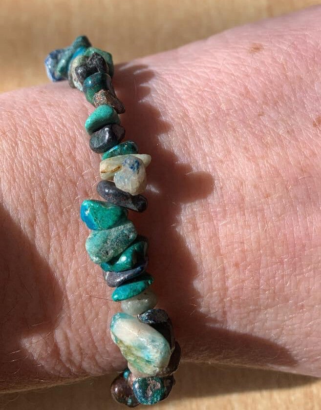Bracelet en pierres naturelles Chrysocolle favorise l’apaisement, la tranquillité et la paix. Elle incite au pardon à la compassion et à la douceur. Elle aide à vivre en harmonie avec nous-mêmes. C’est le bracelet qu’il vous faut. Originaire du Pérou. Au tarif de 7,20 €.